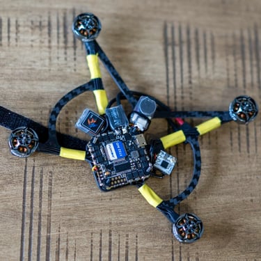 Défis d'intégration : Un montage de haute précision sur une base JHEMCU GHF722AIO. L'espace ultra-réduit a nécessité une expertise avancée en soudure, notamment pour l'utilisation des connecteurs latéraux (side connectors) afin d'intégrer GPS, buzzer autonome et récepteur radio.