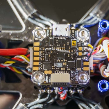 Le Choix Électronique : Utilisation d'une Kiss Ultra Mini V2, une carte exigeante mais réputée pour sa réactivité. Ce montage a nécessité la création d'un câble FC-ESC personnalisé pour faire correspondre l'ordre des moteurs (différent des standards Betaflight).