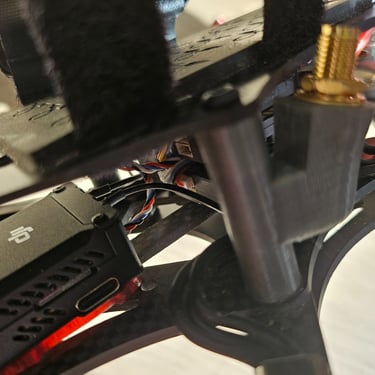 Le Défi de l'Intégration : Récupération et adaptation d'une version "naked" du DJI O3. L'installation a nécessité l'utilisation d'entretoises millimétriques (1.6mm x 3mm) pour un montage "ric-rac" mais parfaitement fonctionnel.
